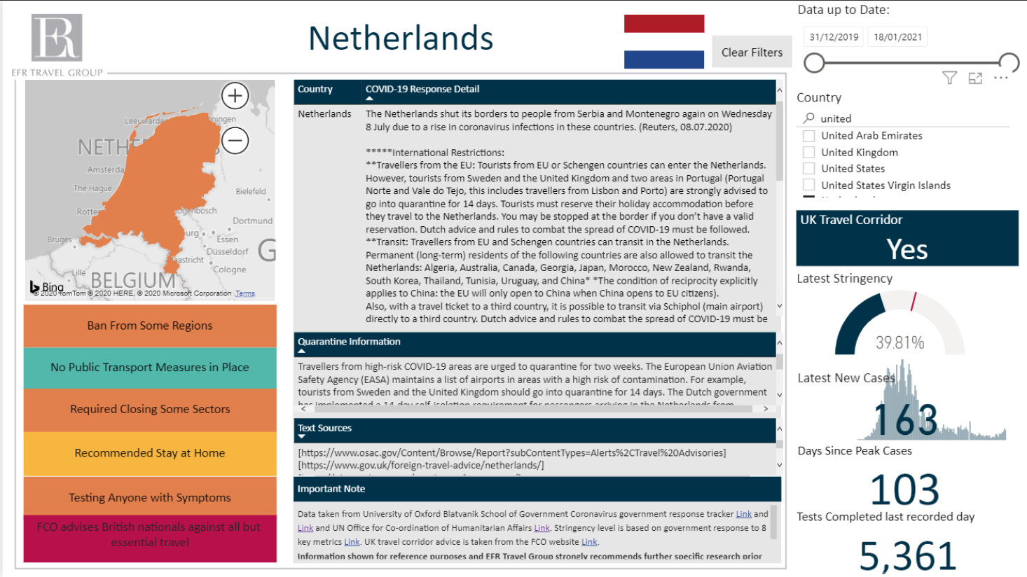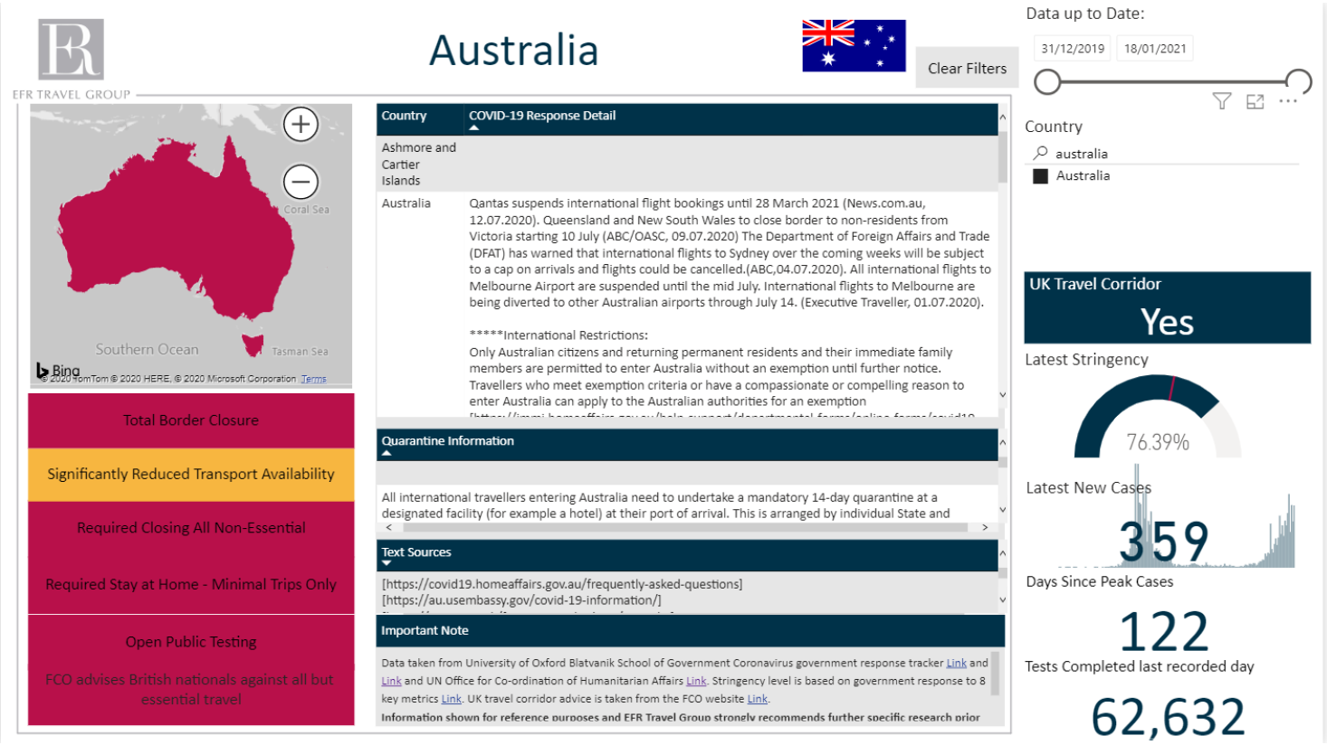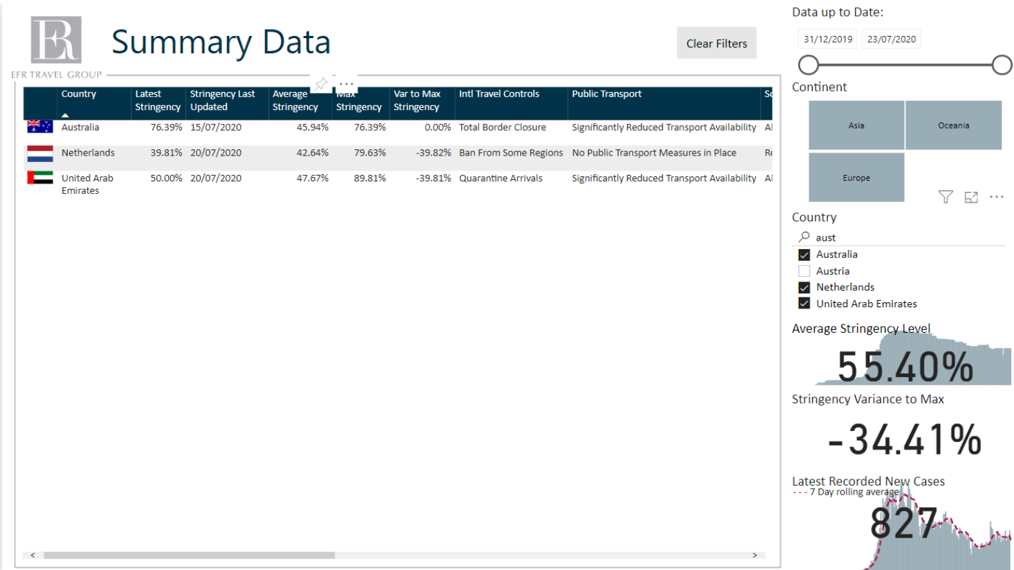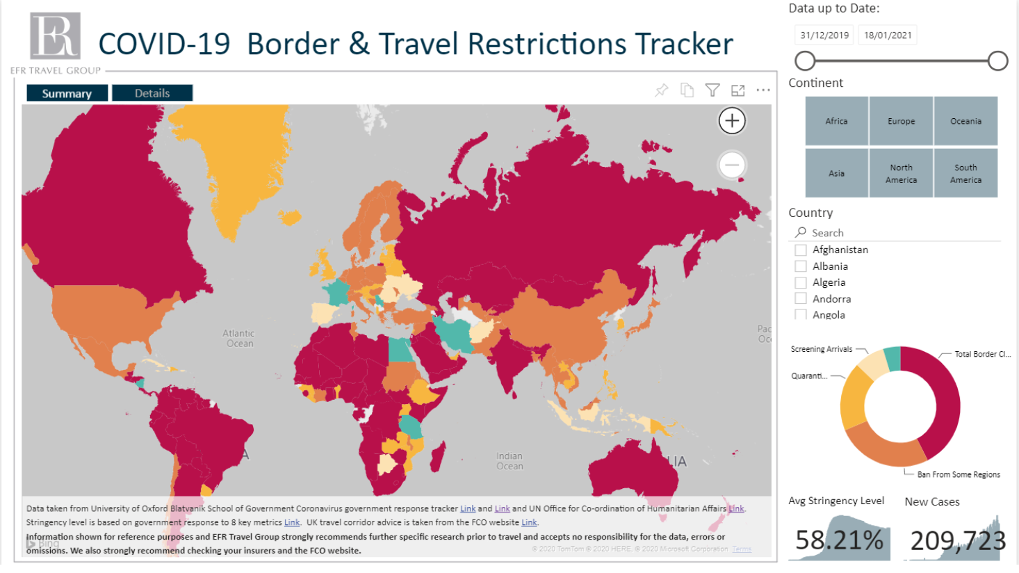 - Reporting on the very latest stringency indices, new cases and test numbers, border and in-country restrictions